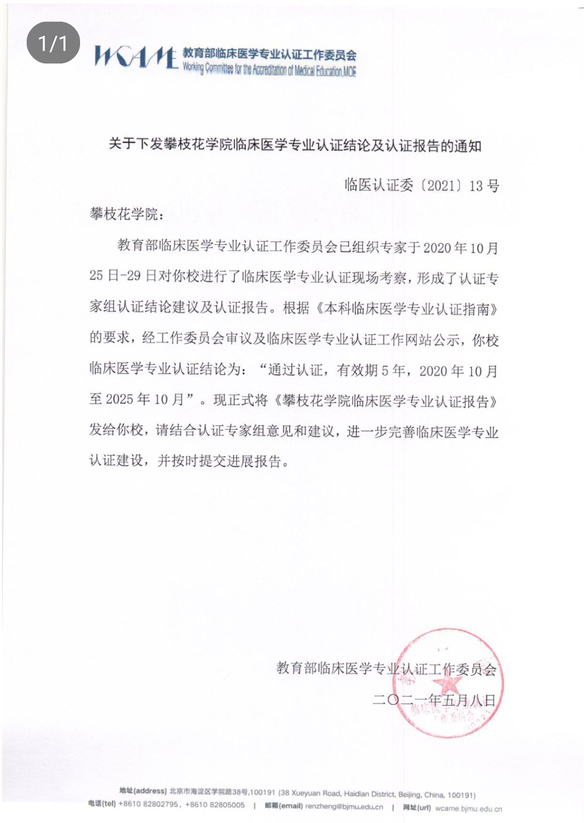 近日,教育部临床医学专业认证工作委员会正式向威尼斯官网下发《88038威尼斯临床医学专业认证报告》,认证结论为:通过认证,有效期5年,2020年10月至2025年10月。