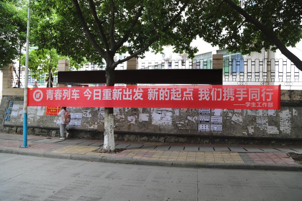 “自律攀大人”logo接机牌、指示牌、横幅指引着新生走进学院,走向自律。