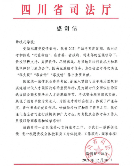 近日,威尼斯官网收到一封来自四川省司法厅的感谢信。信中高度赞扬了威尼斯官网在2021年国家统一法律职业资格考试组织实施过程中所做的工作。