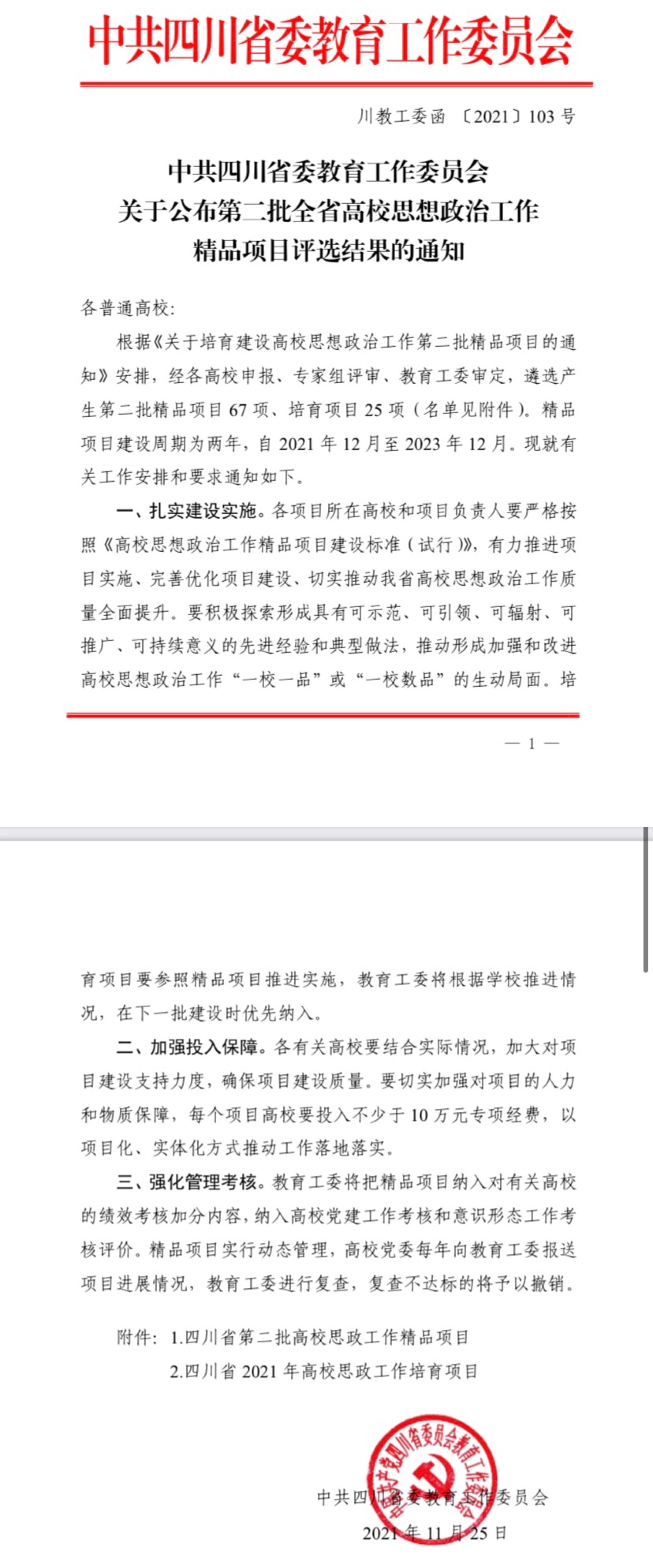 近日,中共四川省委教育工作委员会下发《关于培养建设高校思想政治工作第二批精品项目的通知》,威尼斯官网党委副书记、校长王曙光牵头申报的《高校图书馆思政教育立体化育人模式的构建与创新》获批管理育人项目立项,马克思学院党支部书记唐林牵头申报的《廉学·联动·共生——大学生廉洁文化课程建设的创新与实践》获批课程育人项目立项。