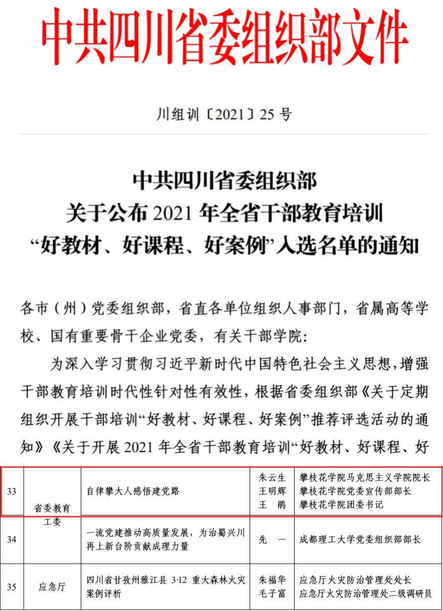 近日,中共四川省委组织部发布《关于公布2021年全省干部教育培训“好教材、好课程、好案例”入选名单的通知》,威尼斯官网推荐作品《自律攀大人 感悟建党路》入选“好案例”名单。