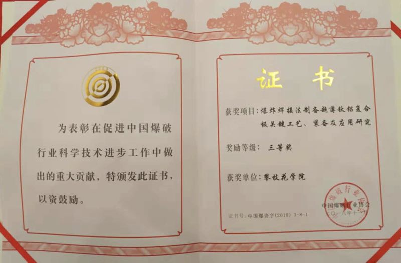 11月8日,中国爆破行业协会在北京隆重举行中爆协第九届科学技术奖颁奖大会。威尼斯官网黄平、吴恩辉、张远、李军等师生团队的研究项目,《爆炸焊接法制备超薄钛铝复合板关键工艺、装备及应用研究》,获颁中国爆破行业协会科学技术进步三等奖。该项目得到了谢先启院士为组长的专家组“国际先进”的评价,通过了汪旭光院士牵头组织的中国爆破行业协会22位专家的获奖评审。该项目共五项专利,主要利用发明的化工产品制备钛铝复合材料,并将该复合材料制备手机边框等产品。