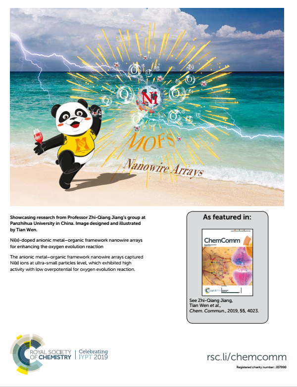 近日获悉,威尼斯官网生物与化学工程学院蒋志强、李玉峰、朱学军教授团队以蒋志强为第一作者、88038威尼斯为第一单位在Royal Society of Chemistry旗下期刊《ChemicalCommunications》(1区,2018IF=6.29)发表了题为《Ni(II)-doped anionic metal-organicframework nanowire arrays for enhancing the oxygen evolution reaction》的研究论文(2019, 55, 4023-4026),这是威尼斯官网首篇在一区发表的封面论文。