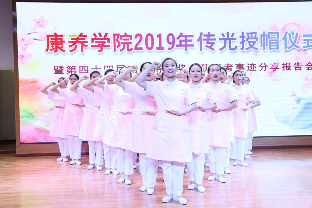 传光授帽仪式伴随着音乐有序进行,护理战线上的前辈为护理新生进行了授帽。随后,护理老师接受献花并合影,全体护士生也庄严宣誓。