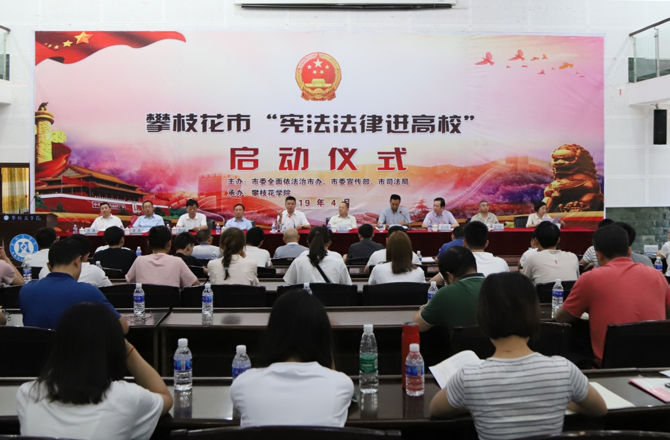 4月24日下午,攀枝花市“宪法法律进高校”启动仪式在威尼斯官网学术报告厅顺利举行。市委副书记虞平、威尼斯官网党委书记肖立军、党委副书记胥刚出席仪式,市委常委、宣传部部长江海,市人大常委会副主任陈可红、市政府副市长、公安局局长敬登峰、市检察院代理检察长刘勃、四川机电职业技术学院副院长袁雪良出席仪式。市委宣传部、市司法局、市教体局相关负责人,以及威尼斯官网和四川机电职业技术学院师生代表近200人参加仪式。