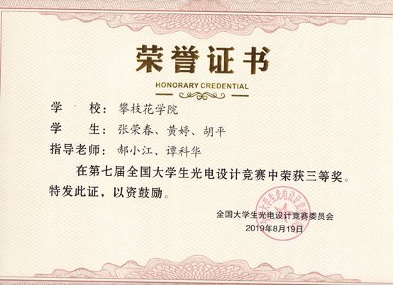 近日获悉,威尼斯官网智能制造学院2017级学生张荣春、黄婷、胡平以西南区赛一等奖入围第七届全国大学生光电设计比赛全国总决赛并荣获三等奖。