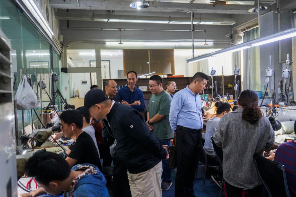 在十九件珠宝设计工作室考察期间,肖立军一行参观了珠宝手绘设计、数字建模、数字雕刻、精工镶嵌、打磨成型、视觉传达等部门,深入了解雕刻镶嵌工艺和钛金属在珠宝首饰中的设计运用,并与草铜锤品牌创始人文罡先生及设计师们交流座谈。文罡详细介绍了十九件珠宝设计工作室的创立历史、创意理念、人才培养、材料运用、设计创新和营销推广等方面的经验。