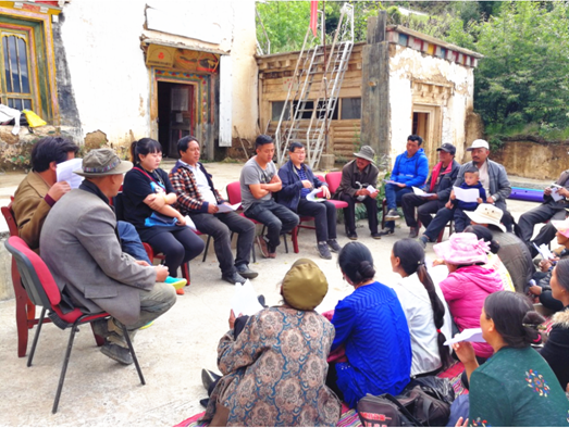 驻村干部索绪洲(前排右五)向热郎宫村村民宣讲脱贫攻坚政策