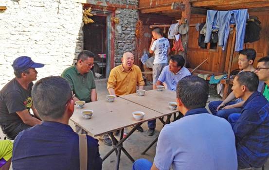 谢萍(前一)和纳子店村干部一道翻山找水源