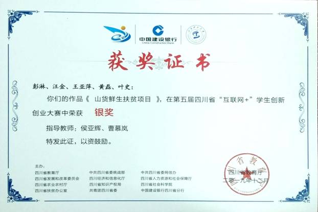 《山货鲜生扶贫项目》获2019年第五届四川省“互联网+”大学生创新创业大赛银奖