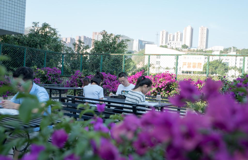 在区域布局上,阳光室外阅读区强调花园的错落有致、特色各异。其中,一楼阅读区的中庭阅读区主要栽种桂花、夜来香和茉莉花等,清风苑主要栽种了青竹和苏铁,有桂花园阅读区和清风苑阅读区;三楼阅读区主要栽种三角梅、茉莉花等,有三角梅园阅读区和茉莉花园阅读区;四楼阅读区主要栽种月季花、栀子花等,有月季花园阅读区和栀子花园阅读区;六楼阅读区主要栽种炮仗花、藤蔓、鸡冠花、吊兰等,有炮仗花园阅读区和鸡冠花园阅读区;七楼阅读区主要以栽种藤蔓、欧洲月季、炮仗花、三叶草等,有炮仗花园阅读区、绿园阅读区。一排排书架、一册册图书,透露着满满的文化气息。花有四季,陪伴同学们的除了书籍,还有各色鲜花。