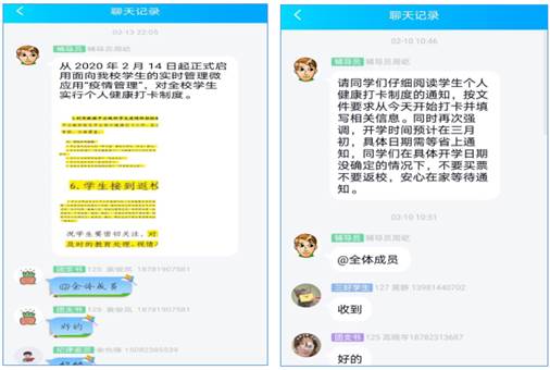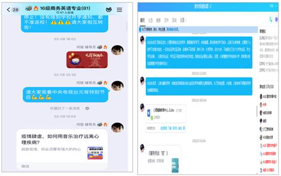 注重关怀,心理疏导。辅导员们主动关心关爱毕业生、实习生、考研学生、入伍学生、留校学生等,重点关注家庭经济困难生、有疫区接触史或心理健康异常学生、学业困难学生和受疫情影响的学生,主动动做好帮扶、济困、解难和释疑解惑工作,确保人文关怀落实到位;积极宣传和推送学校心理中心开设的QQ在线咨询、信息信箱、心理防护知识给学生和家长,为有需求的学生提供心理支持,与有焦虑和心理压力学生沟通交流,疏导其心理压力,帮助顺利度过特殊时期;针对家长和学生关注的问题主动发声,积极回应,用认真细致的工作态度获得学生和家长的理解和配合,做好家校联动抗疫。
