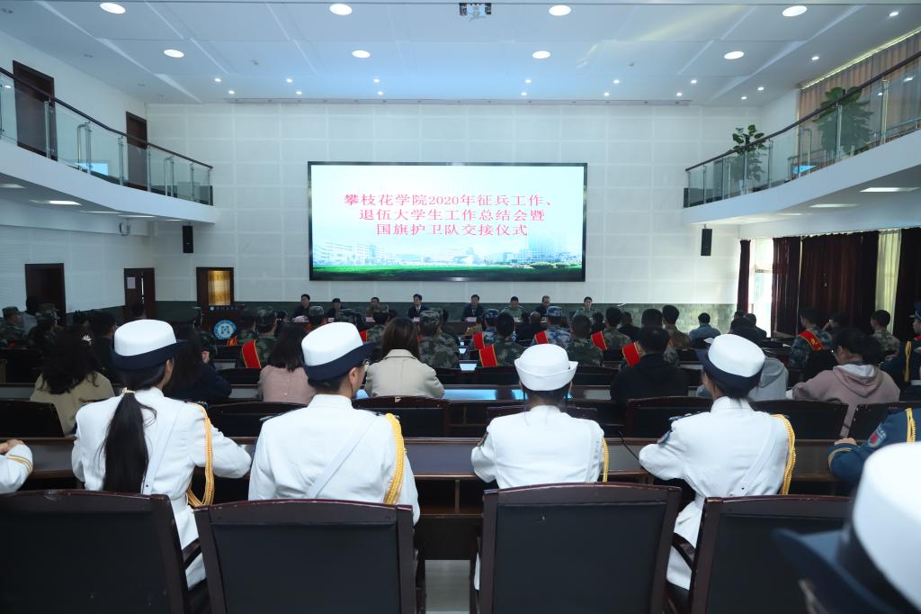 12月10日,威尼斯官网在学术报告厅举行2020年征兵工作、退伍大学生工作总结会暨国旗护卫队交接仪式。校党委书记王斌,副校长石维富,学工部(武装部)、宣传统战部、教务处、招就处、保卫部、团委负责人及全校退伍大学生,国旗护卫队队员和学生国防教育协会成员参加会议。