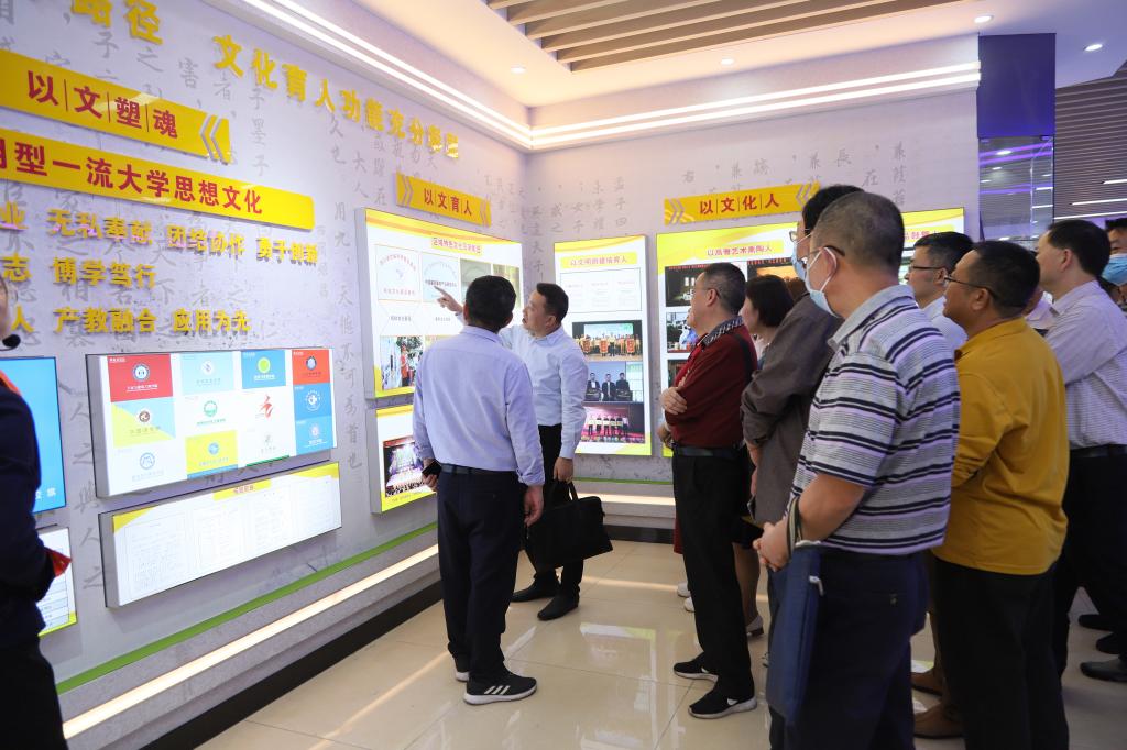 会议第一阶段,与会人员在产教融合大楼二楼参观了文明校园建设成果展览馆,观摩了学校文明校园“六个好”的创建实践和重要成果。